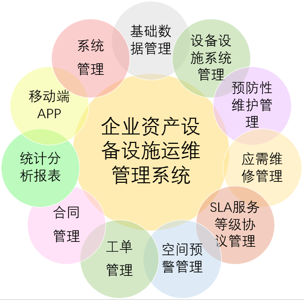 企業(yè)資産設備設施運維管理(lǐ)系統包含基礎信息管理(lǐ)、設備設施系統管理(lǐ)₽、預防性維護管理(lǐ)、應需維修管理(lǐ)、SLA服務等級協議(yì)管理(lǐ)、工(gōng)單管理(lǐ)、統計(jì)分(fēn)析報(bào)表管理(lǐ)、移動端APP、系統管理(l✘ǐ)等模塊。